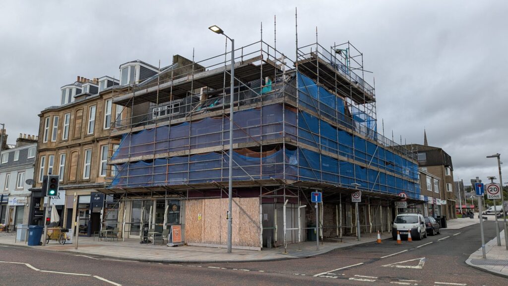 Along with the east side of lower Sinclair Street, the corner of its junction at Princess Street, the bottom of Colquhoun Street, and the efforts to place a temporary roof upon the storm stricken leisure centre, you’d be hard pressed to do a lap of the shops and not find yourself in a cage of scaffolding at some point.